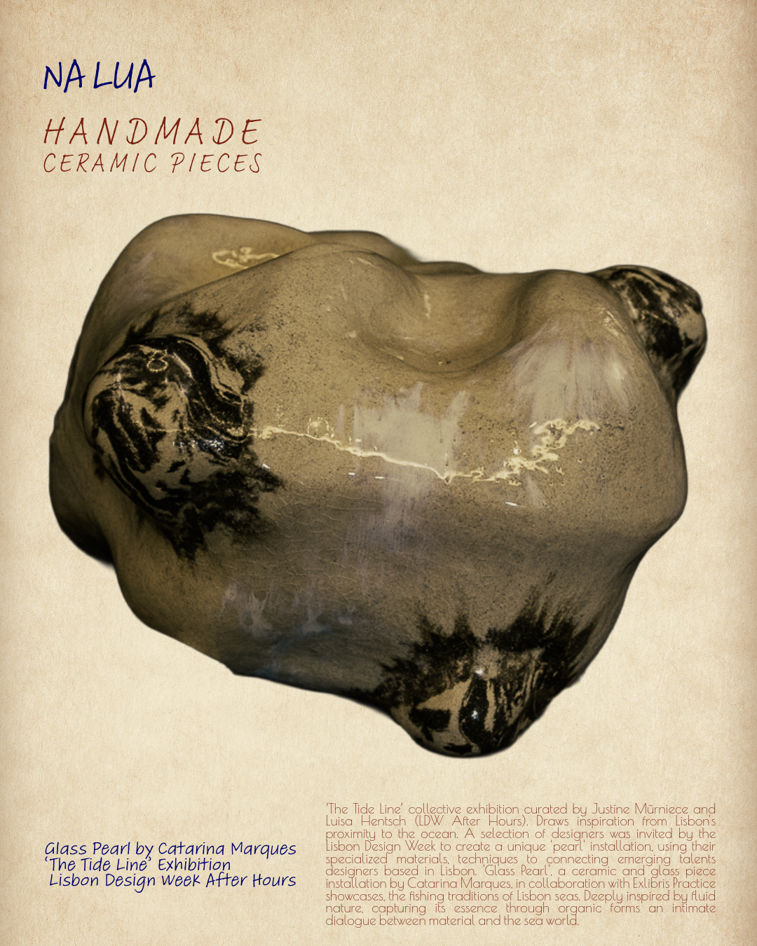 ‘The Tide Line’ collective exhibition curated by Justīne Mūrniece and Luisa Hentsch (LDW After Hours). Draws inspiration from Lisbon's proximity to the ocean. A selection of designers was invited by the Lisbon Design Week to create a unique 'pearl' installation, using their specialized materials, techniques to connecting emerging talents designers based in Lisbon. 'Glass Pearl', a ceramic and glass piece installation by Catarina Marques, in collaboration with Exlibris Practice that showcases the fishing traditions of Lisbon seas. Deeply inspired by fluid nature, capturing its essence through organic forms an intimate dialogue between material and the sea world.