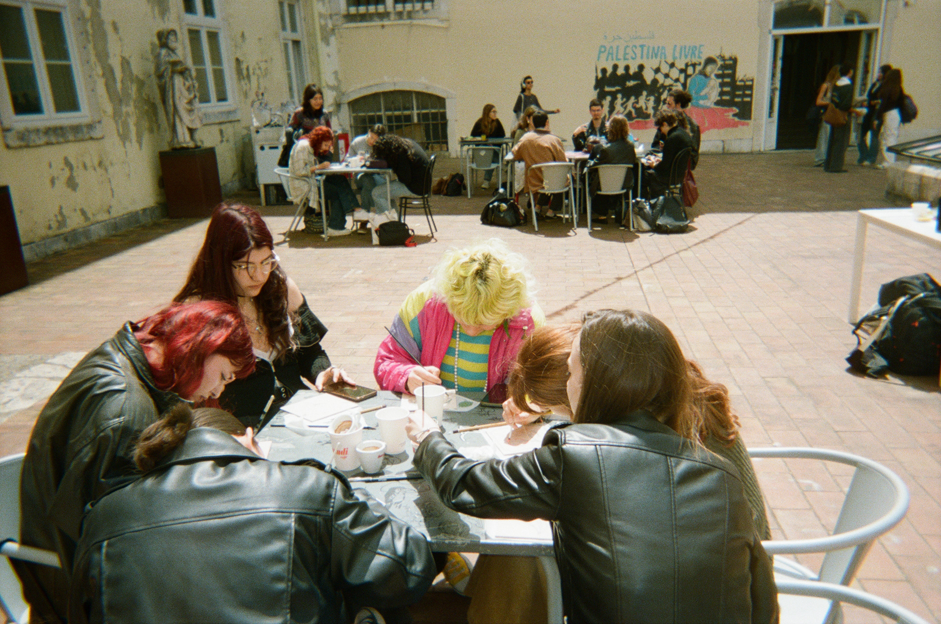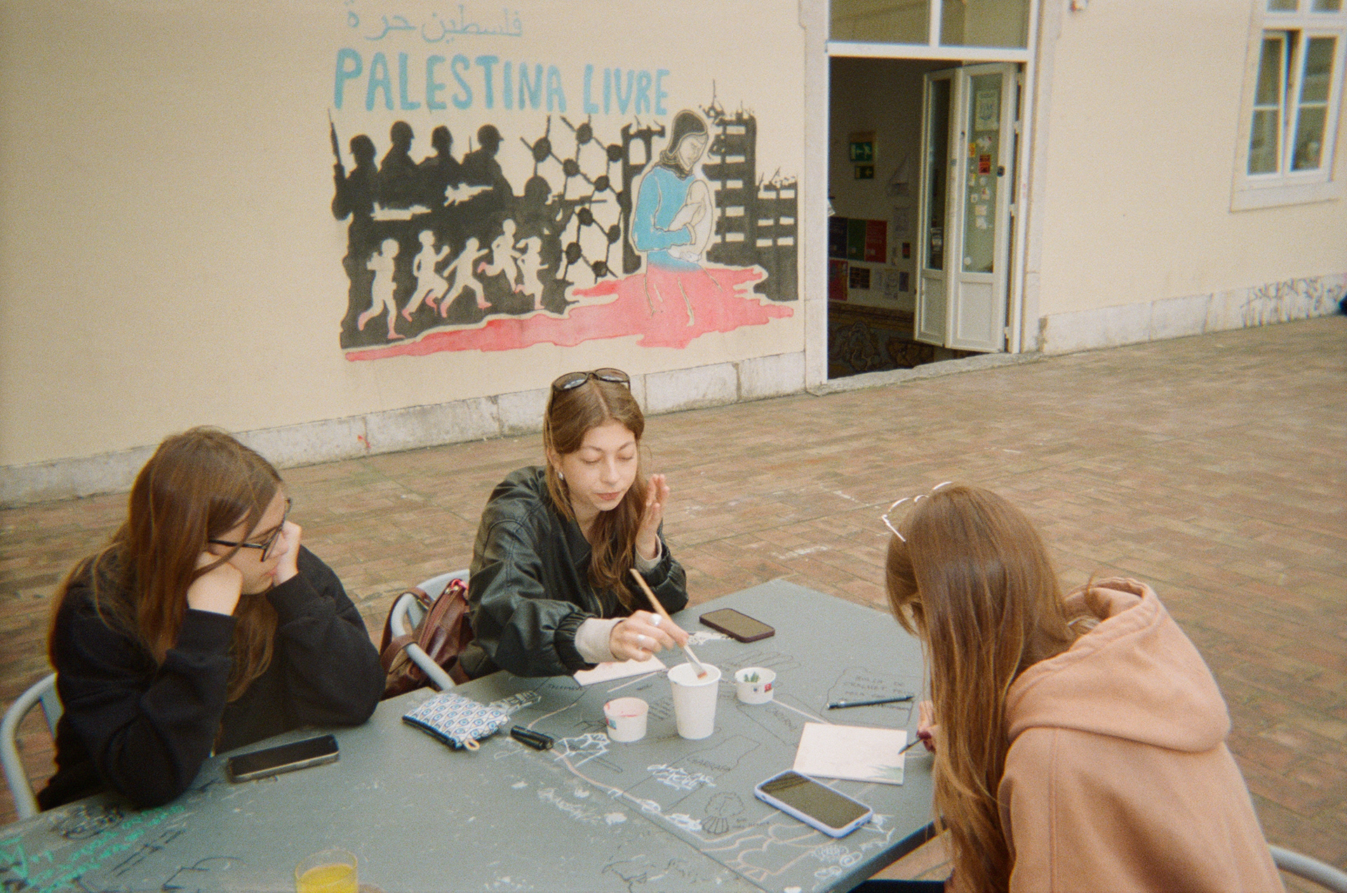 The painting of the tiles has done by transferring designs and freehand painting, using illustrations and phrases alluding to the theme of April 25th: Carnation Revolution (Portugal Freedom Day).